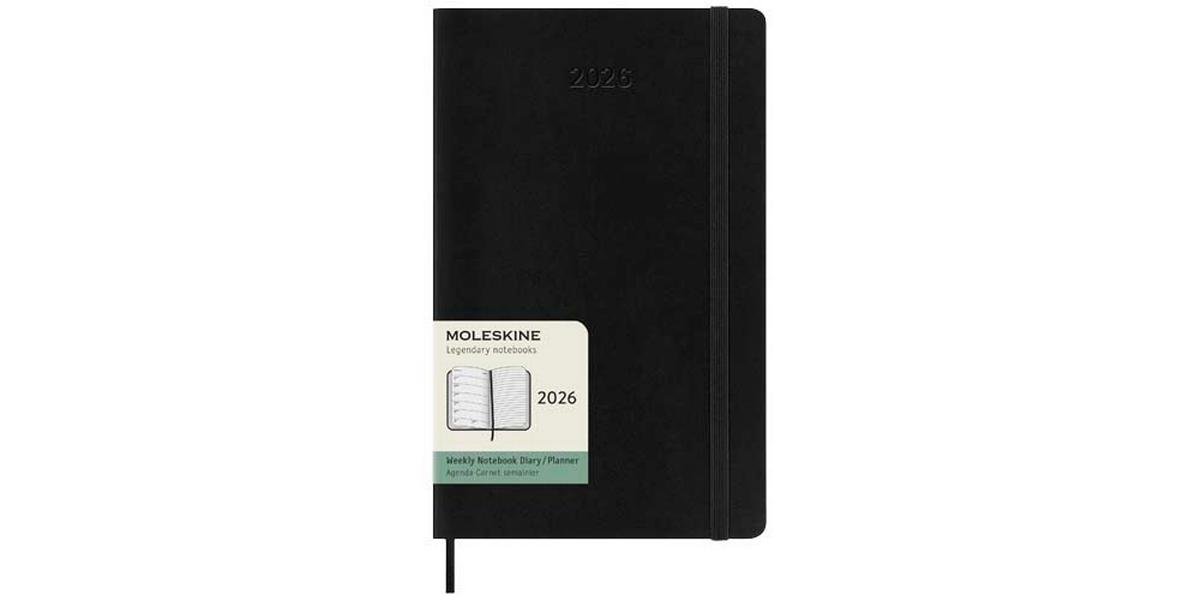 Daté de janvier à décembre 2026, l’agenda hebdomadaire Moleskine de 12 mois à couverture souple permet de visualiser la semaine entière en un coup d’œil, tout en offrant des pages d’instantanés annuels et mensuels pour une vue d’ensemble de l’année, suivies de pages pour la planification des voyages, les idées et les objectifs.