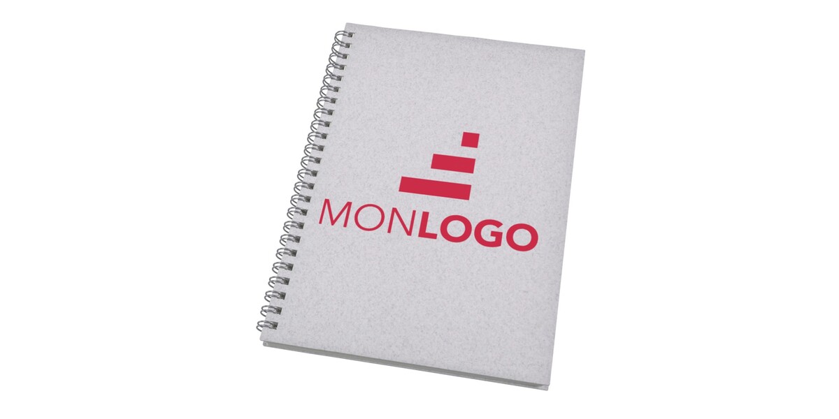 Carnet à spirales au format A5 avec une couverture contenant des matériaux sourcés de manière responsable, soit des déchets de coton (15 %) et des déchets recyclés de post-consommation (40 %).