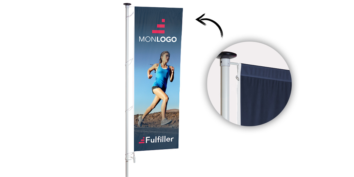 Le haut et le bas du drapeau sont équipés d'un crochet. Les crochets sont ensuite placés tous les mètres. (Par exemple, un drapeau de 4 mètres comporte donc 5 crochets.)