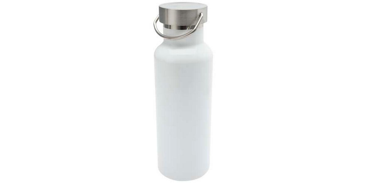 Bouteille d’eau en acier inoxydable durable, à double paroi, avec isolation par le vide et certifiée RCS, un couvercle à vis en acier inoxydable et une boucle de poignée en acier inoxydable durable.