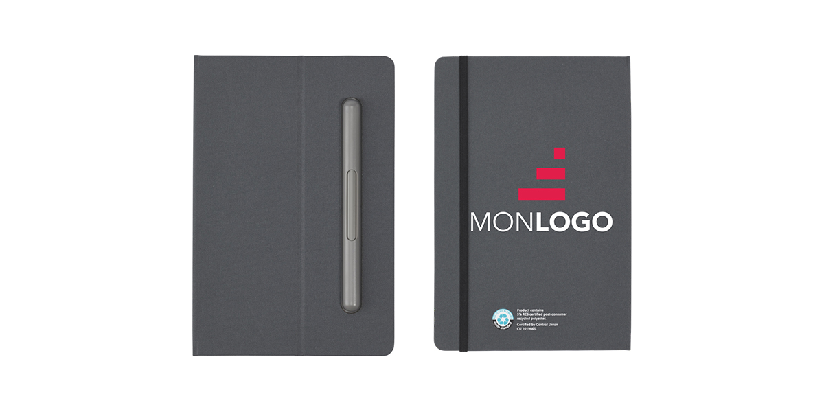 L'ensemble stylo bille et carnet de notes Skribo certifié RCS est partiellement fabriqué à partir de polyester recyclé post-consommation, ce qui en fait un choix plus durable puisqu'il contribue à réduire l'utilisation de matières premières vierges.