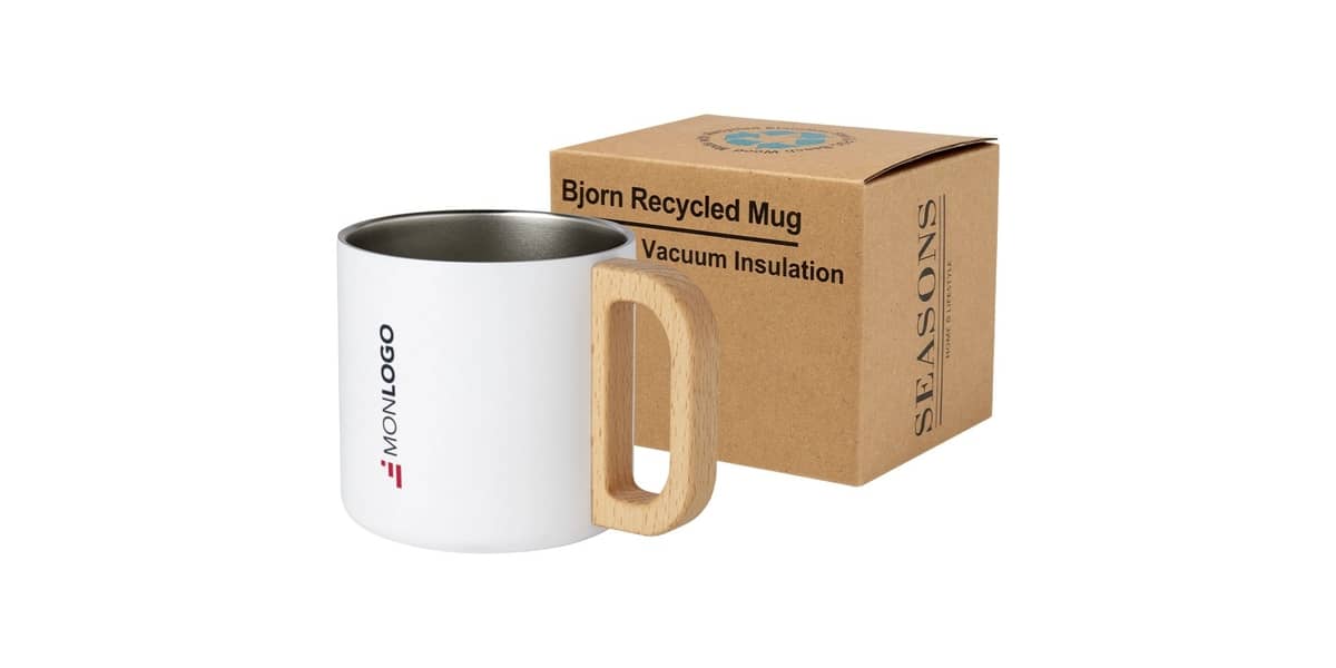 La tasse Bjorn est fabriquée en acier inoxydable recyclé certifié RCS et la poignée est en bois de hêtre provenant de sources responsables.