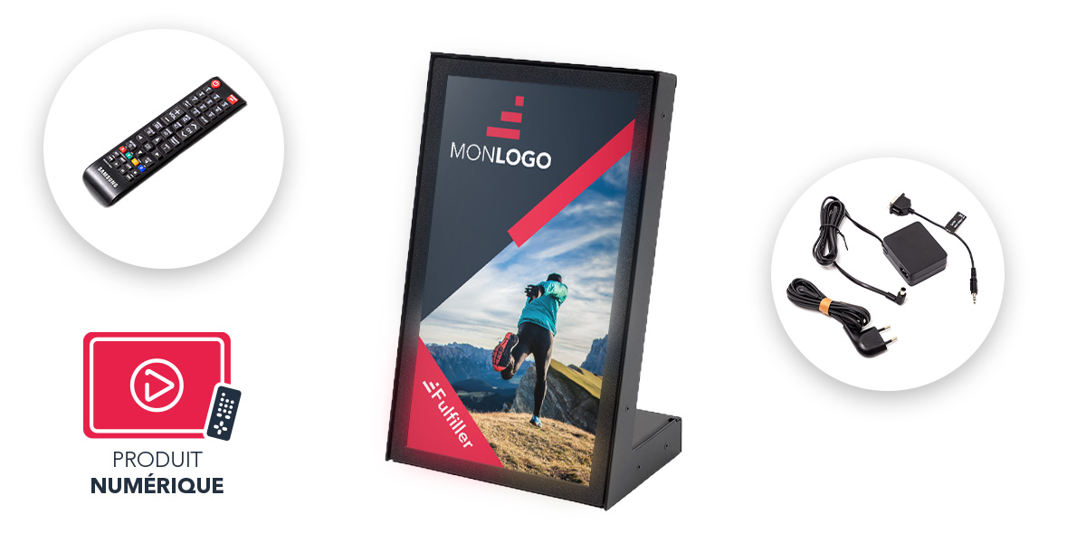PLV numérique de comptoir avec écran Samsung UHD 13” en orientation portrait.
