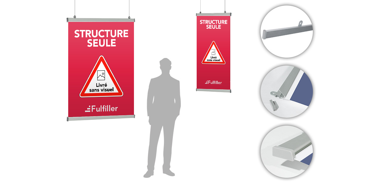 Barres en aluminium avec embouts et crochets en plastique gris. (Un crochet tous les 50 cm soit 2 crochets pour les kakémonos jusqu'à 100 cm. 4 crochets pour un rail de 200 cm)